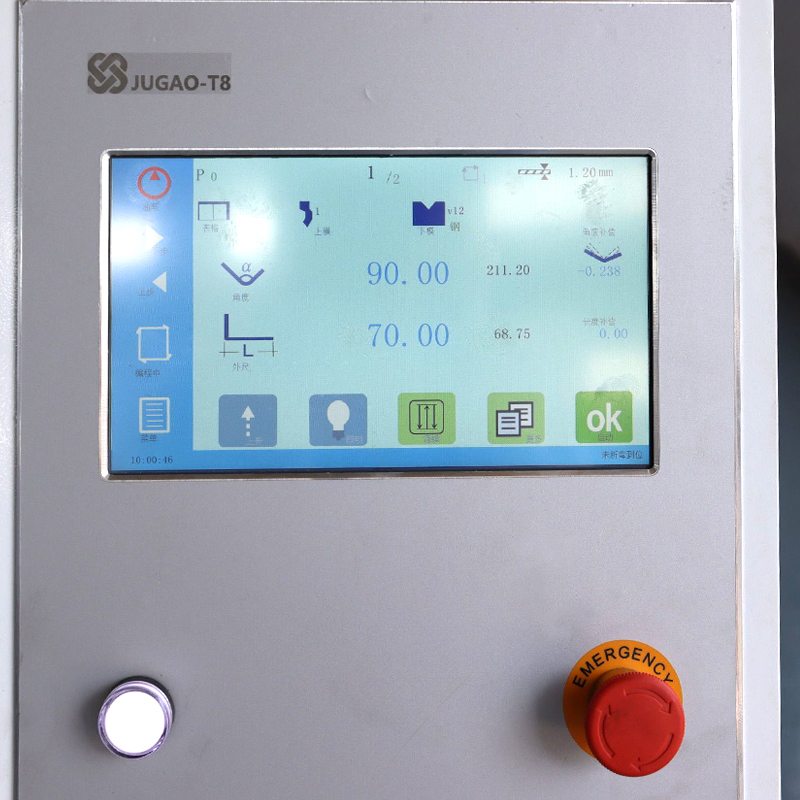 Las ventajas y desventajas de cada sistema se describen en detalle a continuación. El sistema de máquina de flexión de eje de torsión se divide actualmente en dos sistemas principales. 1. El sistema de propósito general está representado por E21. Es muy económico. Pero para operarlo necesitas entender cómo funciona. El valor del eje Y representa la posición donde el molde desciende al punto más bajo. Cambia el ángulo de flexión ajustando el valor Y. Los requisitos para los operadores son relativamente altos. 2. Tome JUGAO-T8 como ejemplo para el sistema de control numérico de la máquina de flexión de eje de torsión. El sistema JUGAOT8 lanzado por nuestra compañía es una versión mejorada basada en TP10S. El contenido específico de la actualización es pantalla táctil grande de 15 pulgadas, interfaces en chino, inglés y español, programación de ángulos, etc. Al mismo tiempo, la suavidad y la estabilidad de la operación del sistema han mejorado significativamente. El sistema tiene requisitos relativamente bajos para los operadores. Se puede realizar flexión automática simplemente ingresando la información del producto procesado y el ángulo de la máquina de flexión. Al mismo tiempo, tiene la función de corrección de ángulo, que se puede utilizar cuando se encuentran errores de procesamiento. El sistema también se actualiza a un accionamiento de motor servo, y la eficiencia de ajuste aumenta más de 4 veces. Además, el sistema JUGAOT8 también tiene buenas ventajas en comparación con otros sistemas como E300 y DA41S. Por ejemplo: el costo de uso es la mitad del precio de un sistema adicional. Pantalla: pantalla táctil de 15 pulgadas, interfaz de operación simple y clara, etc.
