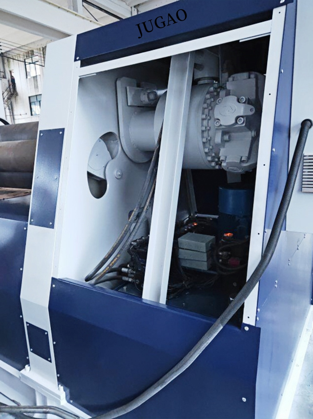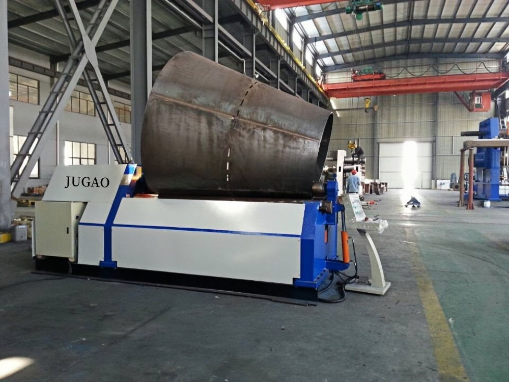 La máquina de laminado de placas de cuatro rodillos es de tipo hidráulico, donde el rodillo superior sirve como el accionamiento principal. Proporciona torque a la placa a través del engranaje de salida del reductor que engrana con el engranaje del rodillo superior. El rodillo inferior es capaz de movimientos de elevación vertical, impulsado por el aceite hidráulico que actúa sobre el pistón dentro del cilindro hidráulico, para sujetar la placa. Además, los rodillos laterales a ambos lados del rodillo inferior están diseñados para movimientos de inclinación a lo largo del riel de cremallera, transmitidos a través de un tornillo sinfín principal. La ventaja de la máquina radica en su capacidad para realizar el pre-doblado de los extremos de la placa y el redondeo en el mismo aparato.