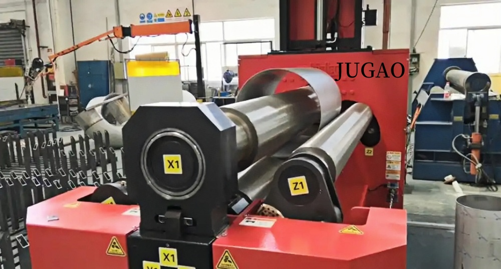 Las placas de metal planas se procesan a través de los tres rodillos de trabajo—dos rodillos inferiores y un rodillo superior—donde el rodillo superior ejerce presión hacia abajo y los rodillos inferiores giran. Esta acción somete la placa de metal a múltiples dobleces continuos, resultando en una deformación plástica permanente y formando la placa en los cilindros, conos u otras formas especificadas deseadas. Una desventaja de la máquina mecánica de rodillos de tres rodillos es que los bordes de la placa requieren un pre-doblado con equipo adicional.