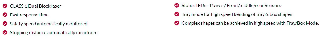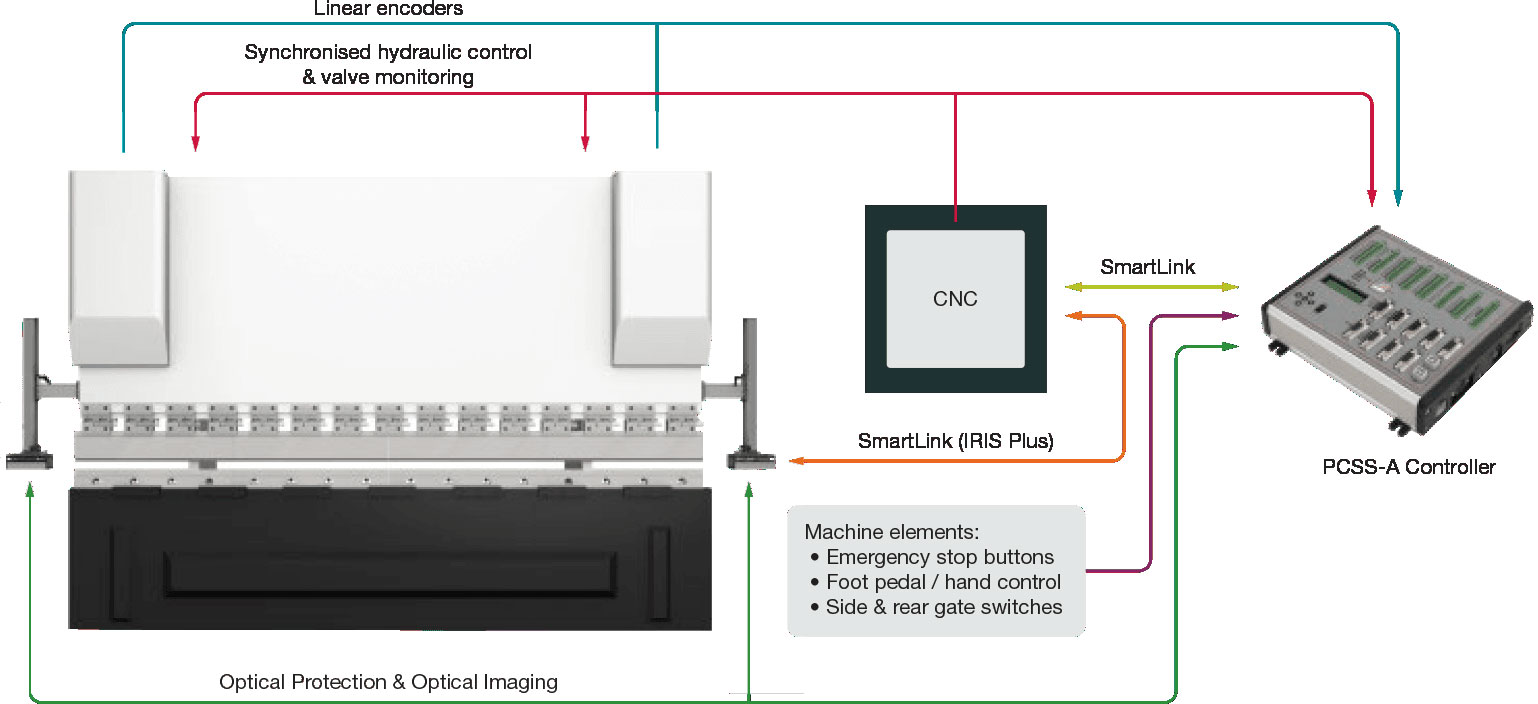 El PCSS-A es un controlador de seguridad programable diseñado para mejorar el rendimiento y la seguridad de las prensas plegadoras. Proporciona flexibilidad para el fabricante de prensas plegadoras y simplifica el proceso de diseño al combinar todas las funciones relacionadas de control, seguridad y monitoreo en un solo sistema, eliminando la necesidad de una integración compleja de componentes y software de terceros. PCSS-A proporciona un equilibrio óptimo de funcionalidad y rendimiento con un costo de construcción reducido.