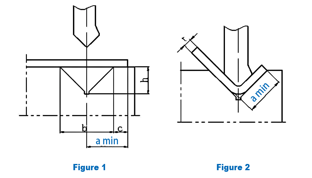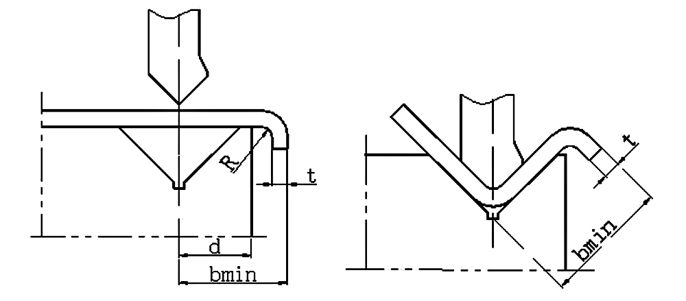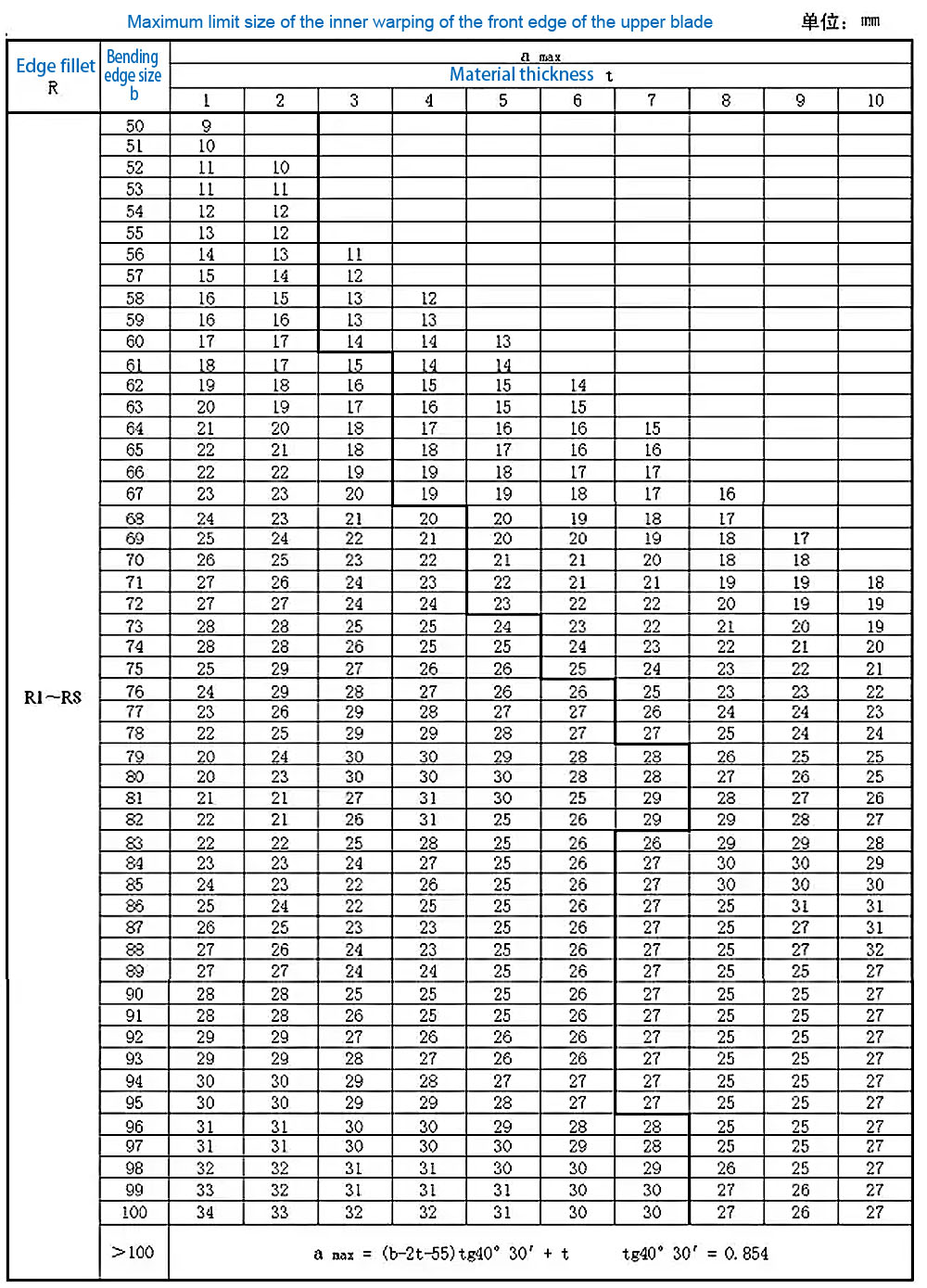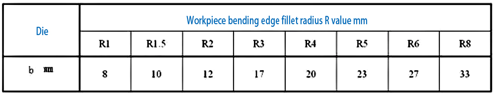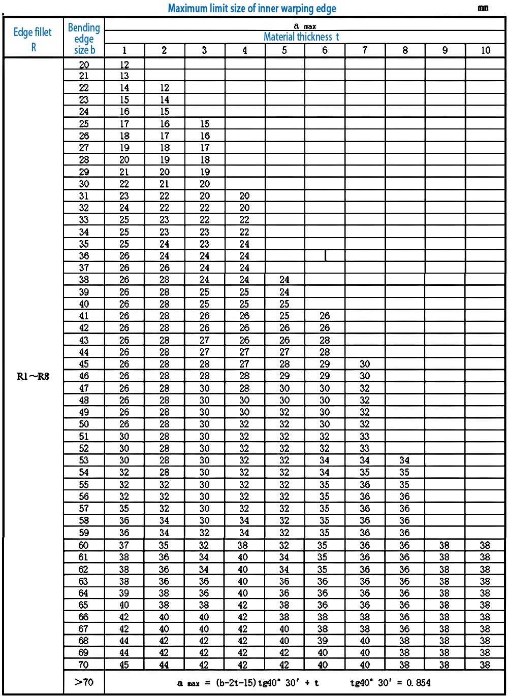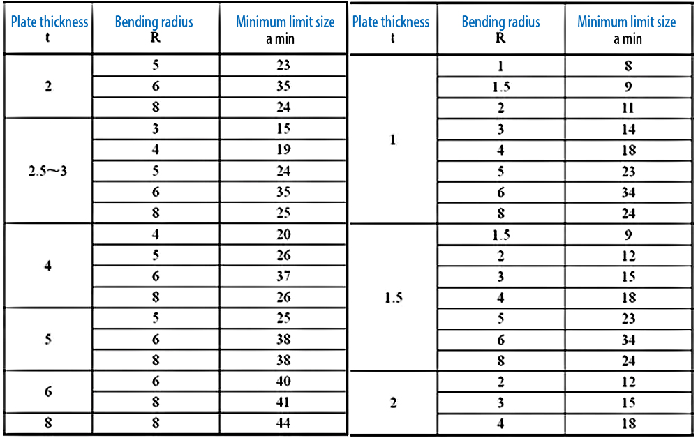 2.La relación entre el tamaño mínimo límite del doblado de borde de regla angular a min (ver Figura 2) y el grosor de la lámina, el radio de doblado y el tamaño del estante se muestra en la tabla.