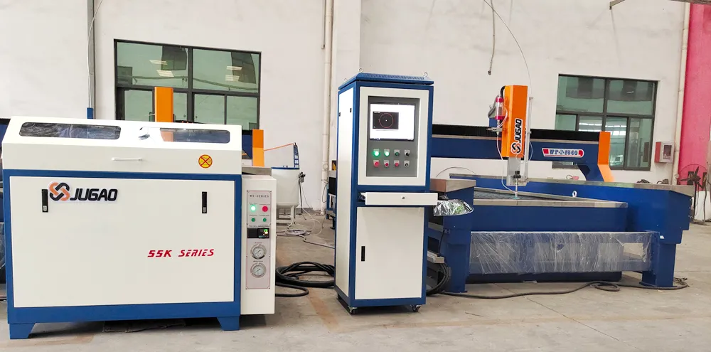 El chorro de agua a alta velocidad se mezcla con arena de diamante para cortar la chapa. No tiene casi restricciones en el material, y el grosor de corte puede alcanzar casi más de 100 mm. También puede cortar cerámica, vidrio y otros materiales que son propensos a estallar durante el corte térmico. Materiales reflectantes al láser como cobre, aluminio pueden ser cortados por chorro de agua, mientras que el corte por láser presenta grandes obstáculos. Sus desventajas son que la velocidad de procesamiento es demasiado lenta, demasiado sucio, no es ecológico, y los consumibles también son altos.